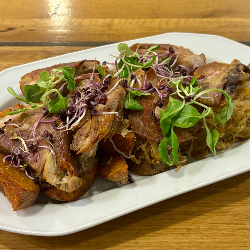 (Grillezett csülök filé, kolozsvári szalonnás pirított-párolt savanyú-káposztával)
